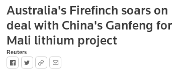 澳洲锂矿企业Firefinch16日表示,和中国赣锋锂业(Ganfeng)签署了一项具有法律约束力的协议。双方将共同开发和运营Firefinch在马里(Mali)的Goulamina项目。