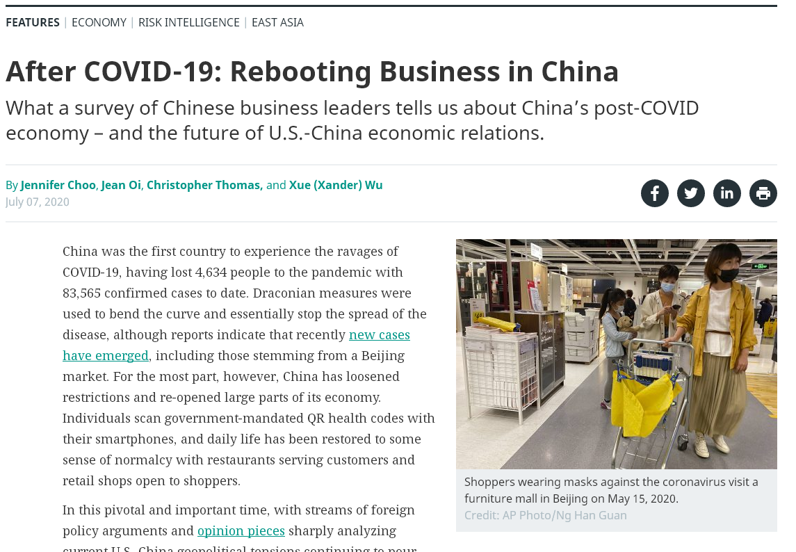 杂志中提到,斯坦福大学中国项目为了更好地了解在华企业在疫情期间如何“复苏”,对135名在华高管进行了调查。接受调查的公司的全球收入总计超过1万亿美元,包括中国本土公司和跨国公司。其中45%的公司是中国私营公司、12%是中国上市公司、42%是合资企业以及跨国公司。尽管选取的企业倾向于高科技和网络公司(55%),但它却包含了各色各样的行业,如工业和汽车(11%)、金融(8%)、消费/零售领域(13%)、其他医疗保健(8%)、媒体和教育(6%)等等。
