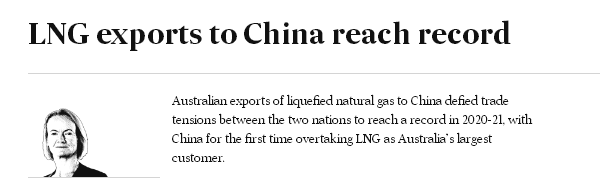 随着中国首次超越日本成为澳洲最大的液化天然气(LNG)买家,澳洲对中国的液化天然气出口没有受两国的贸易紧张局势影响,在2020至2021年创下纪录。