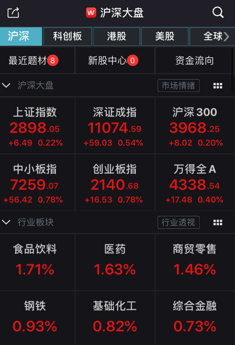 沪深早盘两市低开之后震荡分化,创业板指盘中率先翻红,走势相对较强。维生素、生物疫苗等主题午后走强,医疗、食品饮料、酿酒等防御型板块维持强势表现,两市收盘微