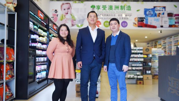 ITM董事陈强(Keong Chan,音译)(中)与澳卖客公司联合创始人约书亚(Joshua Zhou)(右)、林恩(Lynn Zheng)(左)(《悉尼先驱晨报》图片)