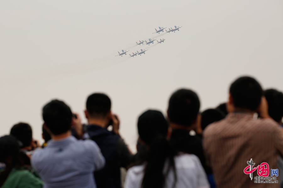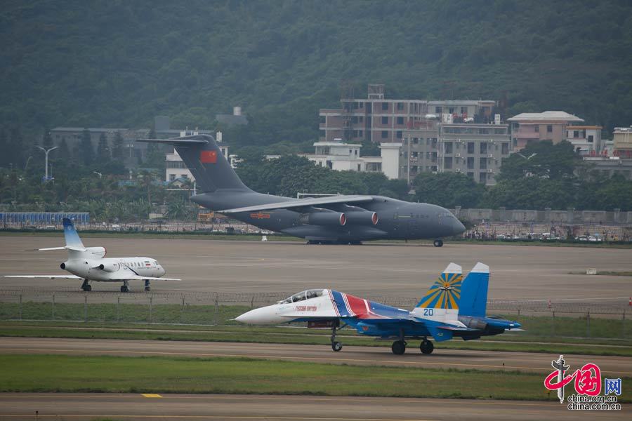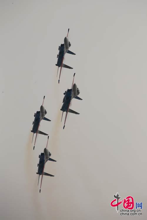 10月30日,记者在中国航展现场看到了已经抵达的俄罗斯勇士及雨燕飞行表演队进行联合演练。5架苏-27和4架米格-29战斗机先后起飞,在空中集结后演练了“库宾卡钻石”、“菱形”形等编队,以及“对头跌升急降”、“郁金花开”等飞行表演动作。