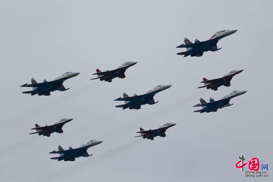 10月30日,记者在中国航展现场看到了已经抵达的俄罗斯勇士及雨燕飞行表演队进行联合演练。5架苏-27和4架米格-29战斗机先后起飞,在空中集结后演练了“库宾卡钻石”