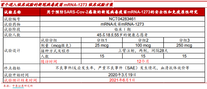 疫苗作为健康人接种的预防性产品而言,本身的安全性是非常重要的;需要遵循疫苗研发的客观科学规律和周期。国务院联防联控机制新闻发布会时国家卫生健康委科技发展中心主任郑忠伟表示预计最快 4 月份部分疫苗有望能够进入临床研究或者应急使用;WHO 预计新型冠状病毒疫苗有望在 18 个月内准备就绪。目前进度最快的 Moderna 公司的 mRNA-1273 预计有望在 2021 年 6 月完成临床Ⅰ期全部试验。