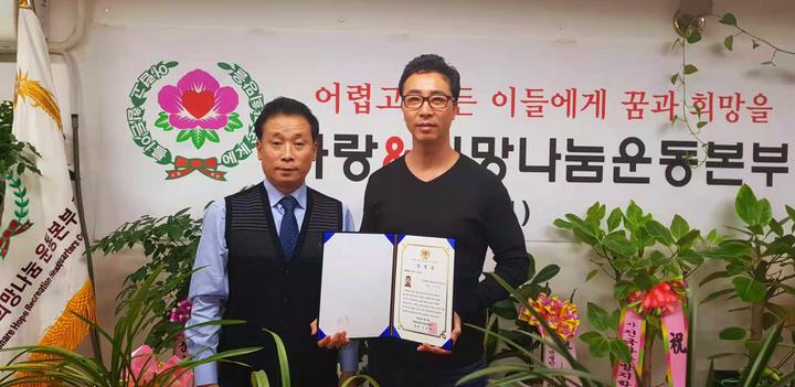 博爱&希望分享运动总裁马弘培(左)同李同镐(右)新任部长合影留念