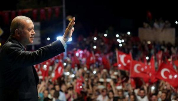 当地时间7月19日,土耳其伊斯坦布尔,民众在土耳其总统埃尔多尔总统府邸前集会抗议政变,埃尔多安对示威人群发表讲话。