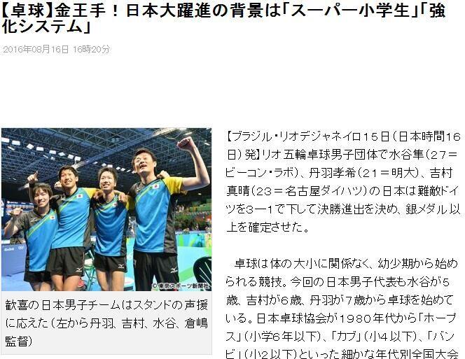 《东京体育》最后说道:“举国体制培养运动员,日本乒乓球出成绩是必然的事情。日本男队在2006年6月还只是排在世界18位,到了2013年已经上升到第三位。本届奥运会更是历史性闯入了决赛。”