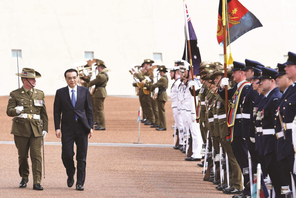 1. 李克强检阅仪仗队,此时一场雨刚过,室外风大,稍显凉意。(澳联社图片)