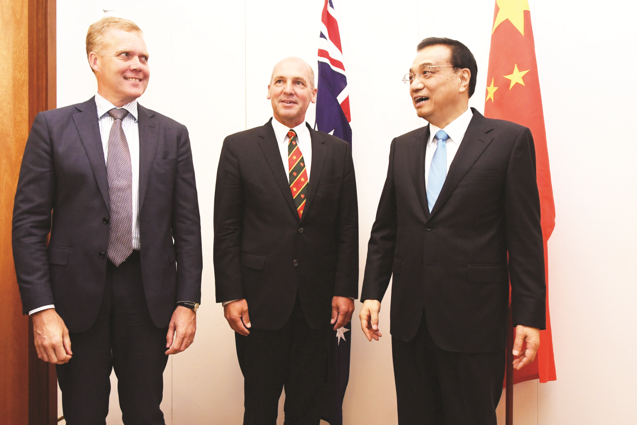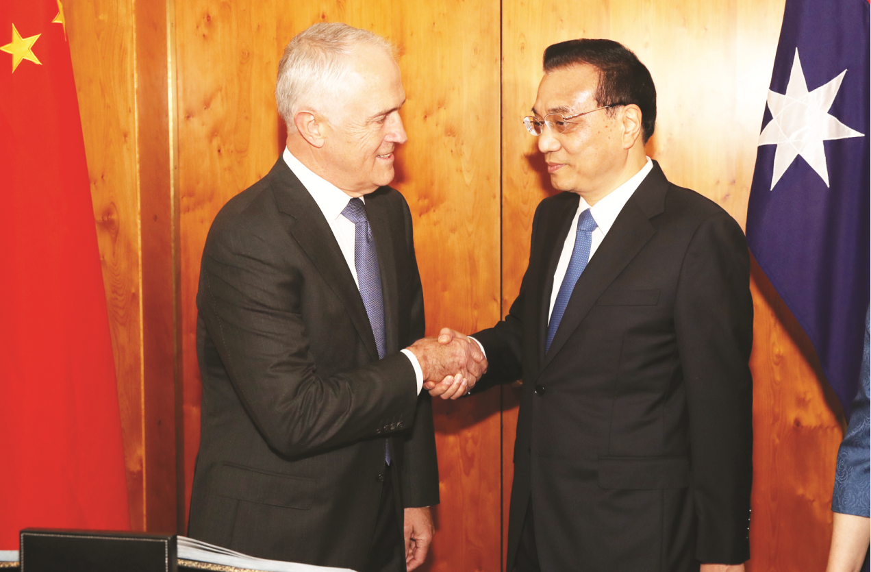 3. 李克强与澳洲总理谭保(Malcolm Turnbull)会面,两人面带微笑。