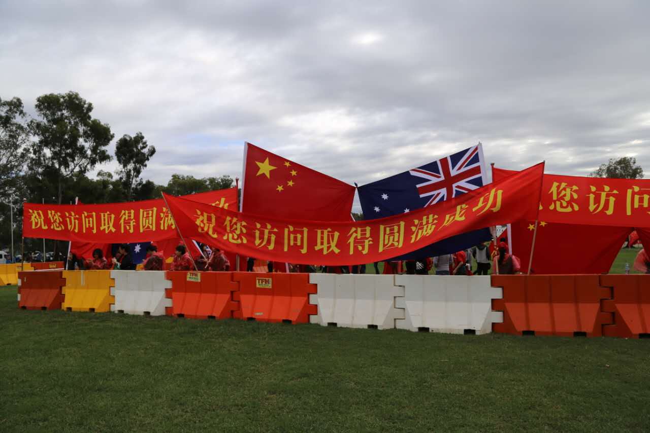 2. 国会广场对面的草坪上,当地华人社区自发组织的欢迎团队早早在此等候。他们拉着横幅,敲锣打鼓,身穿红色的塑料雨披,仿若李克强一行“迷弟迷妹”。