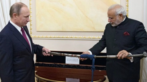 印度总理莫迪日前对俄罗斯展开为期两天的访问,图为莫迪和俄总统普京互赠礼物。据外媒报道,当地时间24日,俄罗斯总统普京在克里姆林宫设宴招待到访的印度总理莫迪。