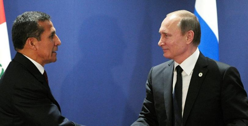 资料图片:秘鲁总统奥良塔·乌马拉与俄罗斯总统弗拉基米尔·普京。据俄媒报道,克里姆林宫新闻局表示,俄罗斯总统弗拉基米尔·普京与秘鲁总统奥良塔·乌马拉举行电话会谈
