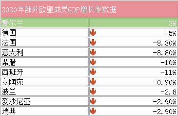 据欧盟委员最新数据统计:2020年爱尔兰国内生产总值(GDP)增长了3%,成为2020年唯一增长的欧盟经济体。而欧盟整体下降6.3%,欧元区下降6.8%。*统计显示:德国去年经济