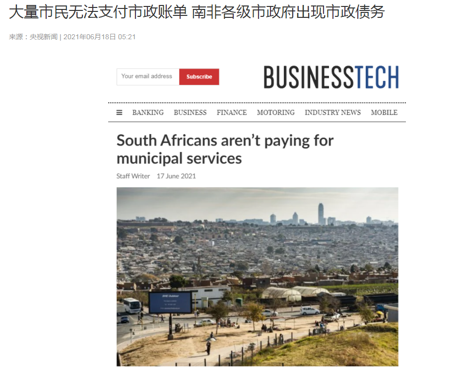 当地时间6月17日报道,南非财政部公布2021年第一季度地方政府收入和支出报告称,近期南非出现市政消费债务升级现象,导致很多市政府很难保障稳定、持续的向市民提供