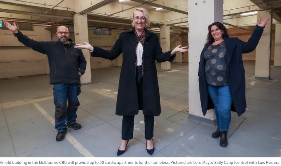 图为墨尔本市市长卡普(中)为了解决墨尔本的无家可归问题,墨尔本市政府近日决定将CBD的一座旧工业建筑改造为流浪者的应急住房。《先驱太阳报》2日报道,小博克街60