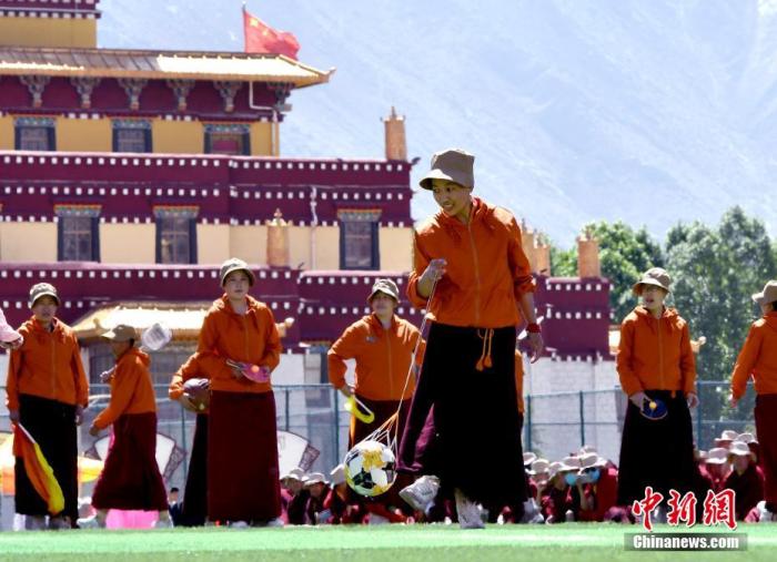 中新社拉萨5月4日电(记者赵朗)西藏佛学院第四届运动会4日在拉萨举行。乐声悠扬,10余名僧人学员上演了自编的简易藏医养生操,动作或徐缓,或刚劲有力。运动会开幕式
