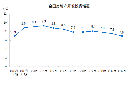 2017年,全国房地产开发投资109799亿元,比上年名义增长7.0%,增速比1-11月份回落0.5个百分点。其中,住宅投资75148亿元,增长9.4%,增速回落0.3个百分点。住宅投资占房地产开发投资的比重为68.4%。