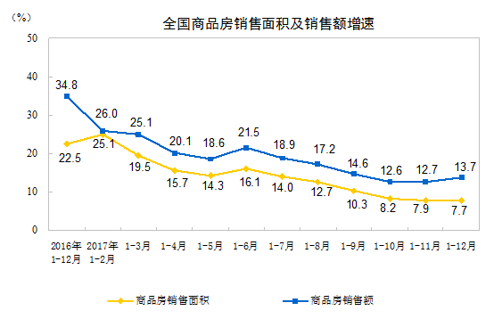 2017年,商品房销售面积169408万平方米,比上年增长7.7%,增速比1-11月份回落0.2个百分点。其中,住宅销售面积增长5.3%,办公楼销售面积增长24.3%,商业营业用房销售面积增长18.7%。商品房销售额133701亿元,增长13.7%,增速提高1个百分点。其中,住宅销售额增长11.3%,办公楼销售额增长17.5%,商业营业用房销售额增长25.3%。