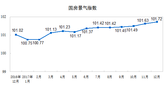 12月份,房地产开发景气指数(简称“国房景气指数”)为101.72,比11月份提高0.09点。
