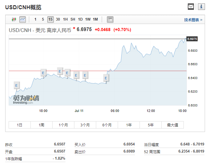 7月11日,离岸人民币兑美元跌破6.7关口,日内跌约500点。截至发稿,离岸人民币兑美元报6.6975,在岸人民币兑美元报6.6754。