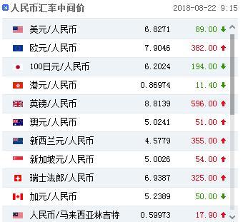 中国人民银行授权中国外汇交易中心公布,2018年8月22日银行间外汇市场人民币汇率中间价为:1美元对人民币6.8271元,1欧元对人民币7.9046元,100日元对人民币6.2024元,1港元对人民币0.86974元,1英镑对人民币8.8139元,1澳大利亚元对人民币5.0241元,1新西兰元对人民币4.5779元,1新加坡元对人民币5.0026元,1瑞士法郎对人民币6.9387元,1加拿大元对人民币5.2389元,人民币1元对0.59973林吉特,人民币1元对9.8380俄罗斯卢布, 人民币1元对2.1067南非兰特,人民币1元对163.60韩元,人民币1元对0.53779阿联酋迪拉姆,人民币1元对0.54918沙特里亚尔,人民币1元对40.9200匈牙利福林,人民币1元对0.54304波兰兹罗提,人民币1元对0.9436丹麦克朗,人民币1元对1.3315瑞典克朗,人民币1元对1.2300挪威克朗,人民币1元对0.88765土耳其里拉,人民币1元对2.7725墨西哥比索,人民币1元对4.7802泰铢。