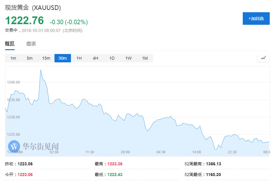 国际现货黄金周二(10月30日)亚市早盘开于1229.35美元/盎司,最高上探至1230.60美元/盎司,最低下探至1219.37美元/盎司,终收于1222.76美元/盎司,下跌6.1美元,跌幅0.5%。