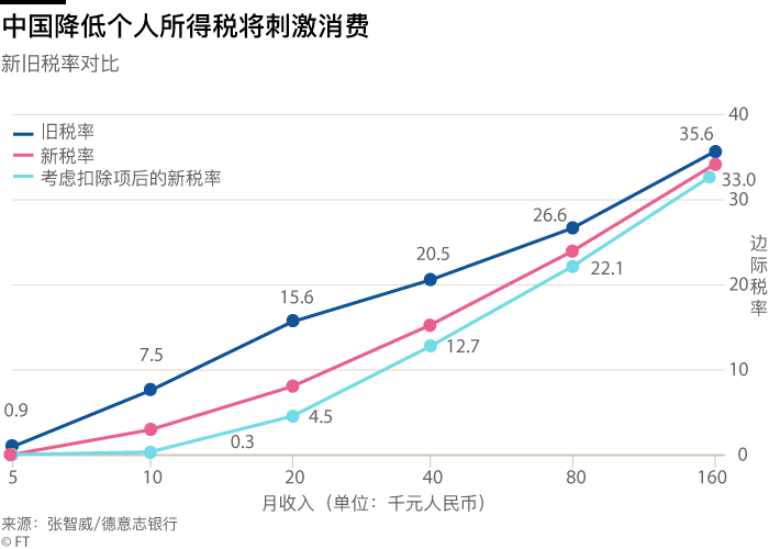 中国立法机关已经通过了旨在降低个税刺激消费的新个税法。德意志银行(Deutsche Bank)的数据显示,新个税法(将于明年1月生效)的减税规模将相当于明年GDP的0.5%,可能促进零售额增长约1%。