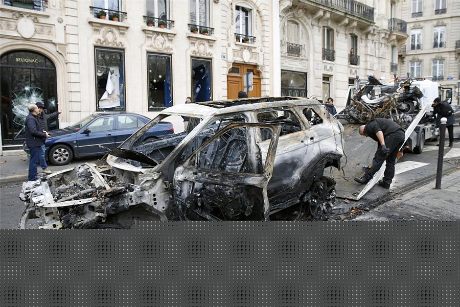 当地时间2018年12月9日,法国巴黎,“黄背心”抗议活动持续进行,商店被砸、汽车被烧毁,街头一片狼藉。Chesnot/视觉中国