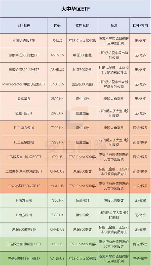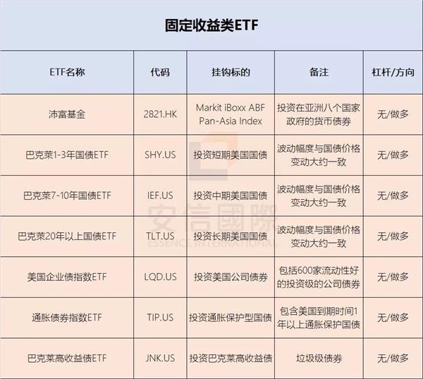 全球经济困局,地缘政治危机。在追逐风险和规避风险互现的环境中,ETF能让你在拥有一个股票账户的情况下轻松买遍全球的投资品类,带来稳健的收益。以下为安信国际为你整理的港美股主要的ETF,供参考。
