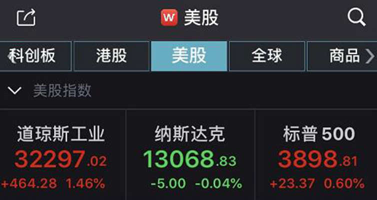 截至收盘,道琼斯工业指数涨464.28点,涨幅1.46%,报32297.02点;纳斯达克指数跌5点,跌幅0.04%,报13068.83点;标普500指数涨23.37点,涨幅0.6%,报3898.81点。
