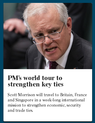 澳洲总理莫里森(Scott Morrison)近日将前往英国、法国和新加坡进行为期一周的国事访问,以加强与关键盟友的经济、安全和贸易关系,并在—太平洋地区建立战略合作。