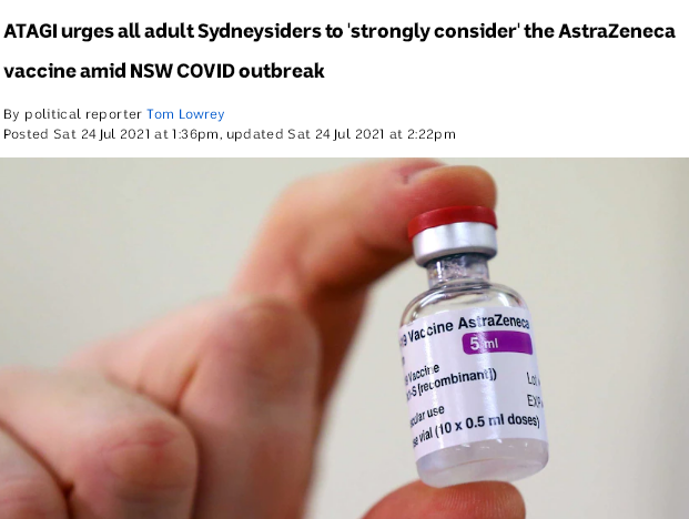 而随着新一轮疫情的报道,ATAGI则宣布修改疫苗接种建议。此前,ATAGI一直表示,60岁以下的澳人因血栓风险,应该选择接种辉瑞疫苗而不是阿斯利康疫苗。但之后,由于澳洲总理莫里森(Scott Morrison)和澳洲医学协会主席霍尔希德(Omar Khorshid)的呼吁,ATAGI改称,所有澳洲成年人都应尽快接种疫苗,而且不限疫苗种类。ATAGI机构在一份声明中表示:“这是基于疫情风险增加和辉瑞疫苗的供应持续受限所改变的接种建议。此外,疫情高分析地区的民众可以在第一剂疫苗4到8周后就接种第二剂疫苗,而不是通常的12周。”