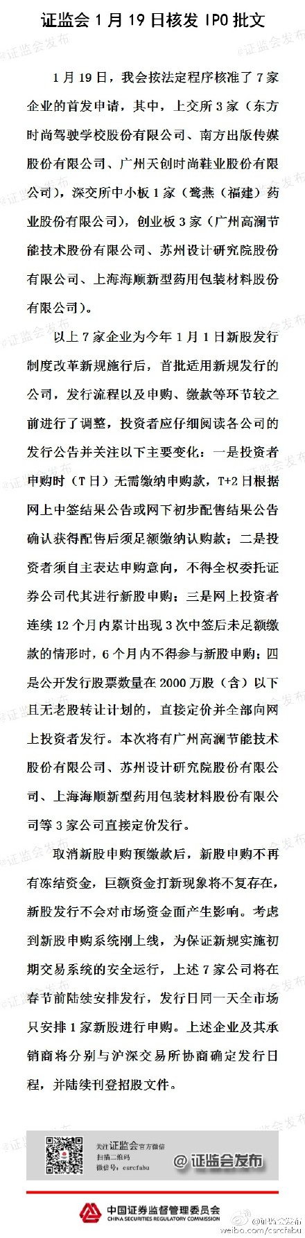 以上7家企业为今年1月1日新股发行制度改革新规施行后,首批适用新规发行的公司。