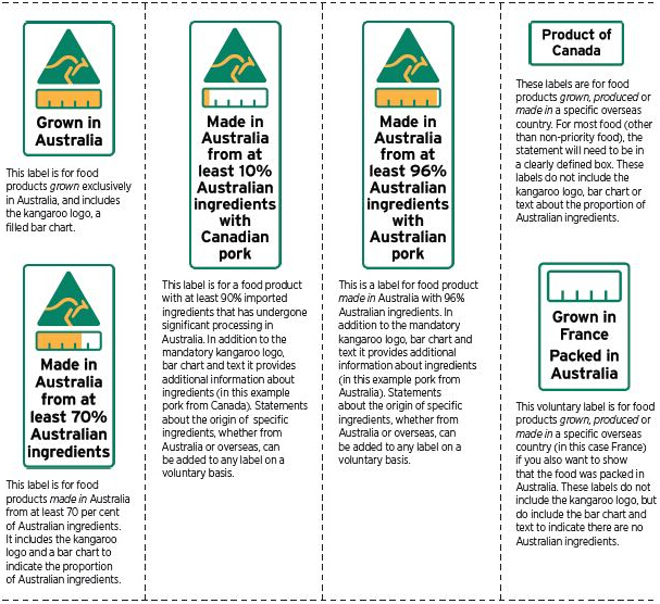 在澳洲制造、生产或种植的食品将带有袋鼠徽标,其它类型的食品则会有条形图,让消费者知道当中澳洲原料的比例。
