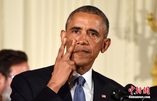 当地时间1月5日,奥巴马在白宫举行发布会,宣布将采取系列行政措施遏制枪支暴力。他在提及2012年康涅狄格州纽敦桑迪胡克小学枪击案时落泪,直言“每次想到这些孩子,我都感到悲愤”。该枪击案造成20名学童死亡。图为奥巴马擦拭眼泪。中新社记者 张蔚然 摄
