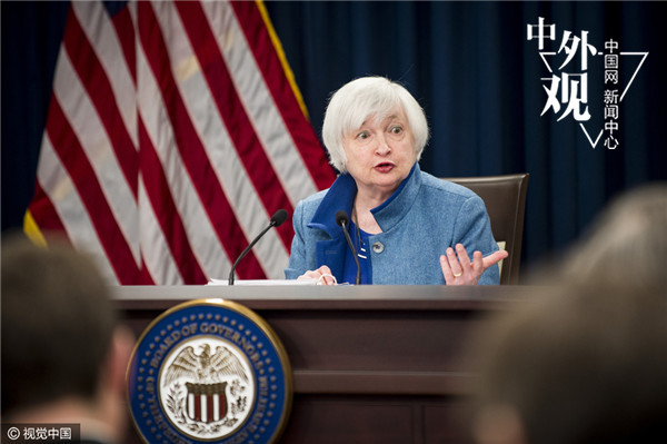 当地时间2016年12月14日,美国华盛顿,美联储主席耶伦在美联储宣布加息后出席新闻发布会表示,议息会议认为经济出现相当进展。美国经济将进一步表现良好,预计未来数年经济增速温和。就业市场将在一定程度上进一步走强。视觉中国