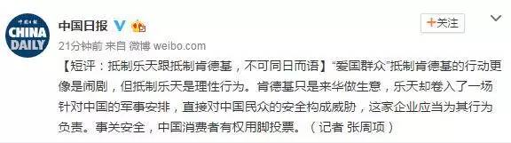 中国日报官微称:“爱国群众”抵制肯德基的行动更像是闹剧,但抵制乐天是理性行为。