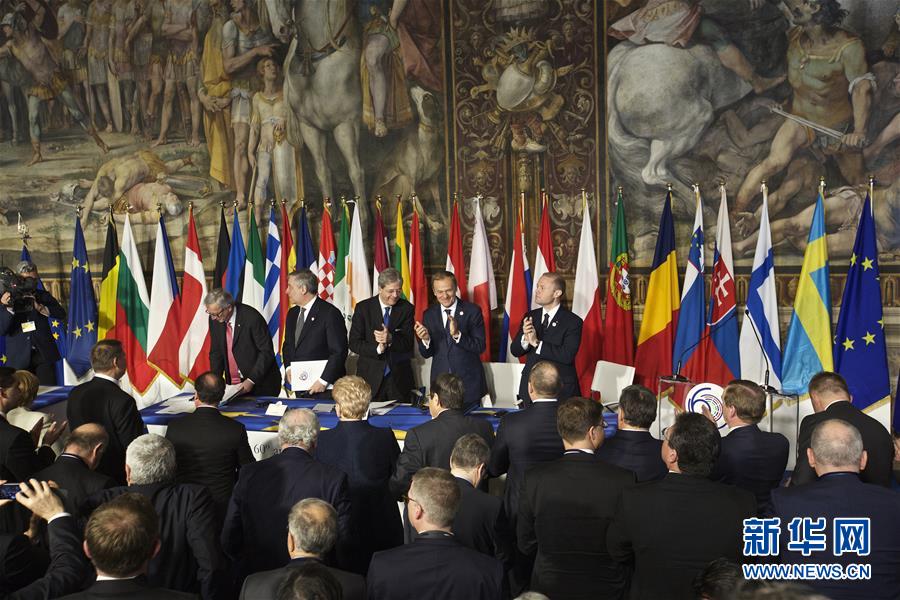 3月25日,与会领导人在意大利罗马参加欧盟特别峰会。纪念《罗马条约》签署60周年欧盟特别峰会25日在意大利首都罗马举行。会议期间,除英国以外欧盟27个成员国的领导