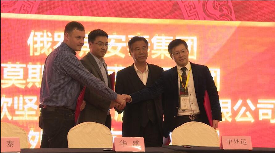 俄罗斯安泰集、莫斯科华盛国际集团、中外运山东有限公司齐鲁事业部、上海欧坚网络发展股份有限公司签约仪式(左起:俄罗斯安泰集团副总经理Evgenii、莫