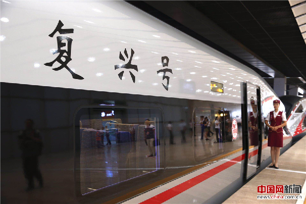 2017年9月21日,从北京出发的G1次“复兴号”中国标准动车组驶往上海。当日零时起,7对由中国完全自主研发知识产权的“复兴号”中国标准动车组首次在京沪高铁进行达速运行,即最高时速350公里,从北京南抵达上海虹桥的时长将缩短至4小时30分钟。中国网记者 陈维松 摄