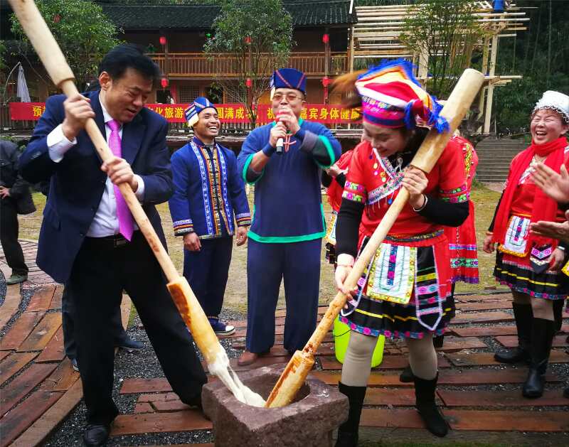 新宁县委书记秦立军(左一)体验瑶族民俗文化指导乡村发展