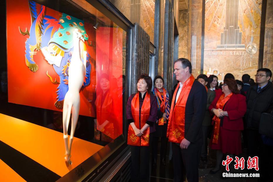 当地时间2月13日,帝国大厦狗年欢乐春节橱窗展在纽约帝国大厦一层亮相,展览为期一个月。图为中国驻纽约总领事章启月(左一)同帝国大厦集团总裁兼首席运营官约翰·凯斯勒参观帝国大厦狗年欢乐春节橱窗展。当天还举行了纽约帝国大厦庆祝2018年中国春节点灯仪式。帝国大厦将于2月13日、15日(除夕)两晚点亮庆祝中国新年的彩灯。中新社记者 马德林 摄