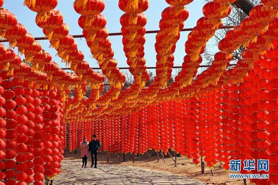2月13日,在湖北省十堰市子胥湖生态新区风车广场,游客在“春”字造型旁拍照留影。 春节将至,各地红红火火,一派喜气景象。新华社发(曹忠宏 摄)