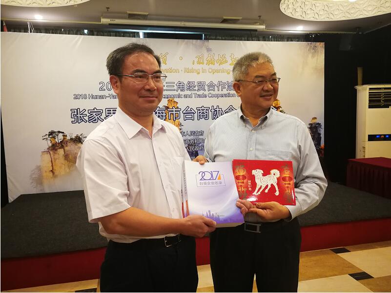 上海台商协会常务副会长胡兴中(右)给张家界市长刘革安赠送上海台商名册和礼品(王建军摄影)