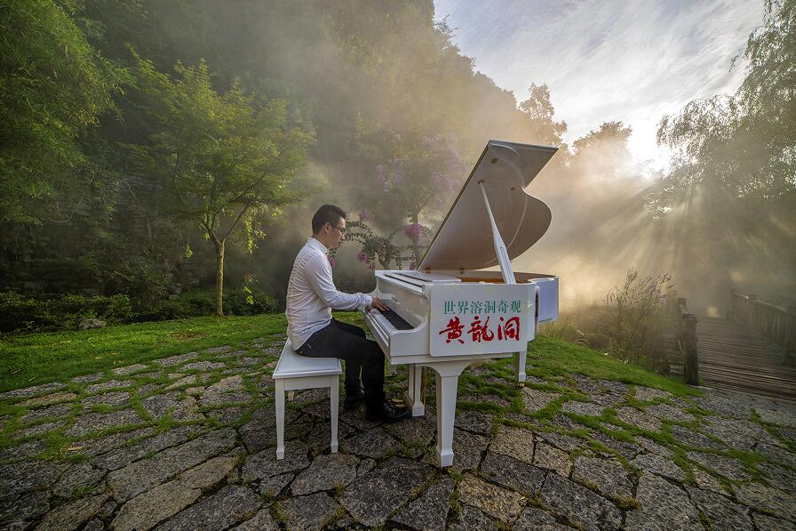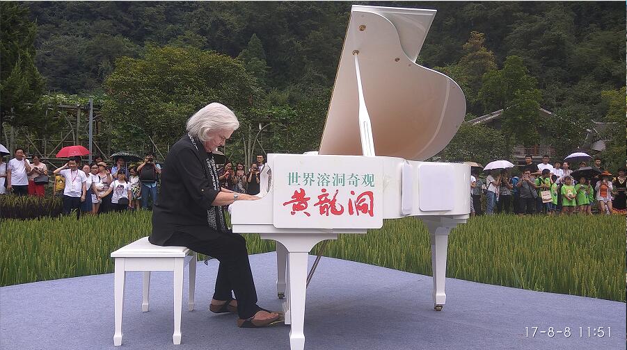 2017年黄龙音乐季期间,美国著名钢琴大师黛博拉·莫里亚蒂在黄龙洞景区稻田中央进行钢琴演奏,引来上千名中外游客的驻足围观。