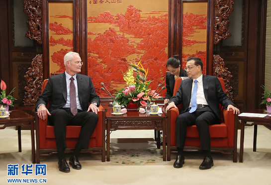 9月7日,国务院总理李克强在北京中南海紫光阁会见美国埃克森美孚公司董事长兼首席执行官伍德伦。 新华社记者 刘卫兵 摄