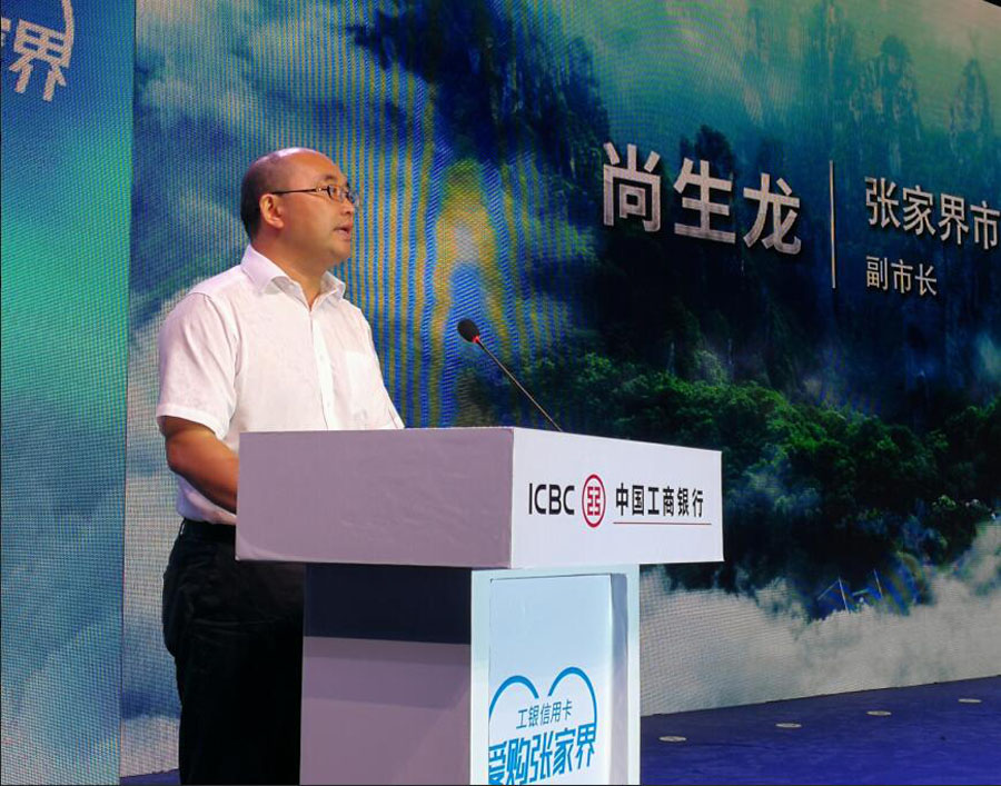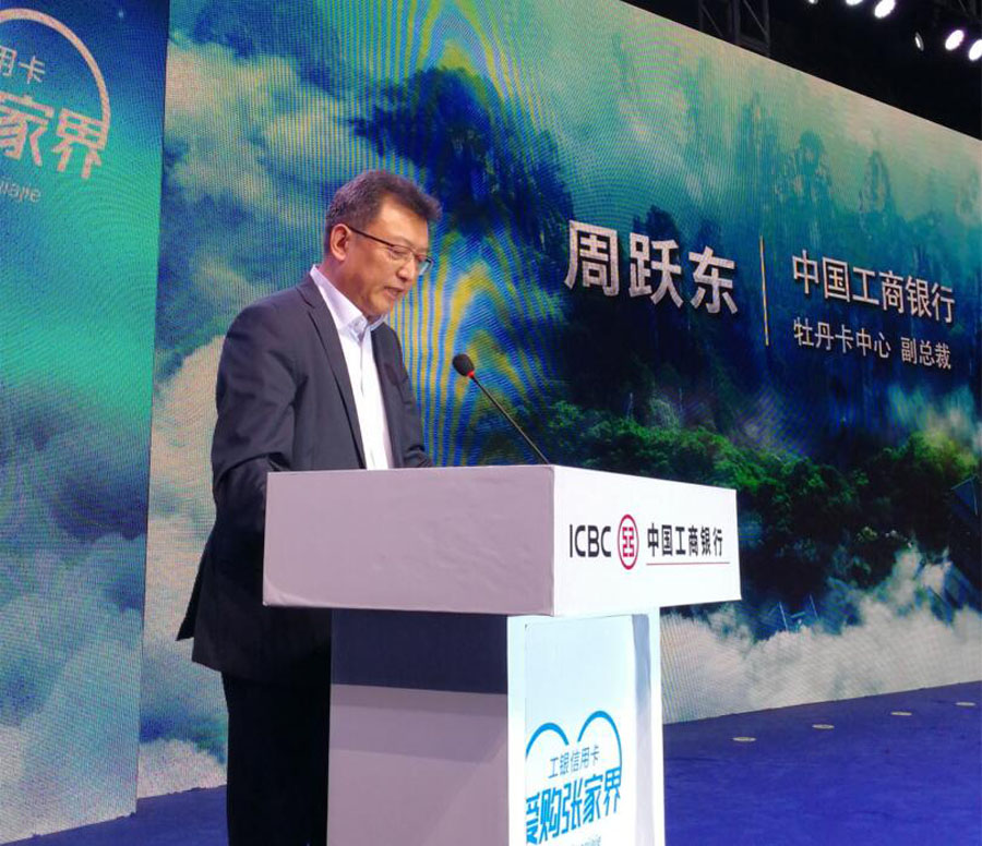 中国工商银行牡丹卡中心副总裁周跃东在“爱购张家界”启动仪式上讲话;