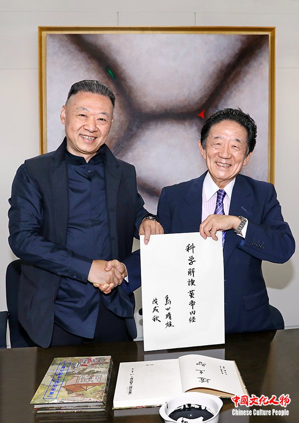 世界知名经济学家、日本首相府内阁顾问、首都大学理事长岛田晴雄会见世界黄帝内经文化促进会会长王寅并亲笔题写“科学解读黄帝内经”
