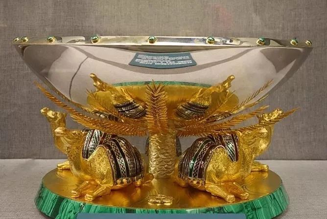 这件镀金卧驼银盘是2001年6月,阿拉伯联合酋长国赠。