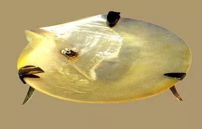 这件构思新奇、简单朴素的贝壳烟碟,是1982年菲律宾所赠。烟碟用一只双壳贝的单侧贝壳制成,表面抛光后保留贝壳天然的色泽,底部有银圈托,边部镶三只银足。烟碟左右两侧各有一个架烟的搁架,碟中镶一枚菲律宾国徽,表明了该礼品的产地。在这件充分展示天然美的烟碟上,以国徽作饰,显得庄严不凡,也更突出了地方色彩。